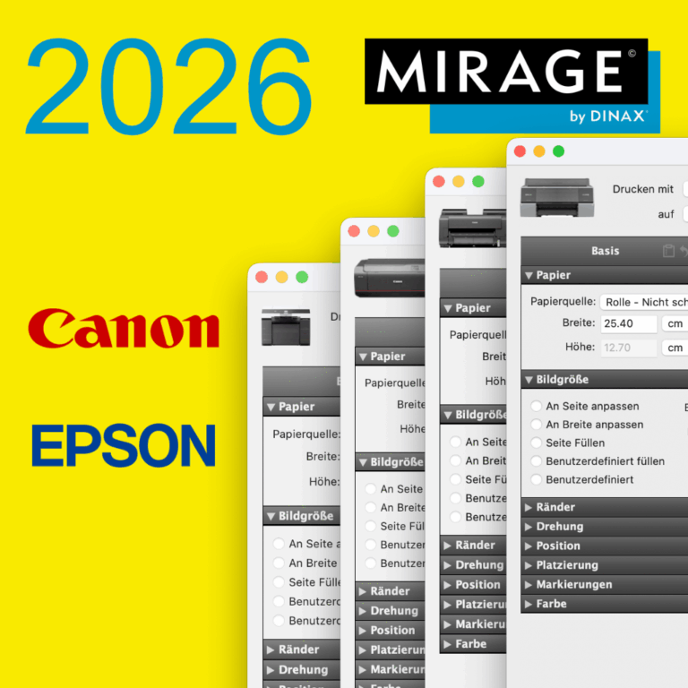 Die Mirage Ultimate Edition unterstützt alle Epson und Canon Drucker, die mit der Software angesteuert werden können.